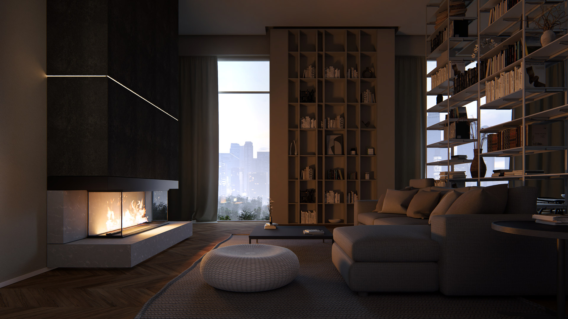 展示現代空間的精緻感。透過層次化的照明設計 (Layered lighting) 與深刻的夜晚氛圍,完美呈現場景的深度與立體感。